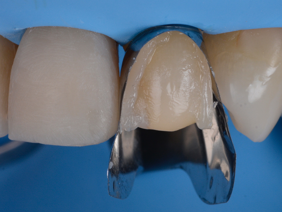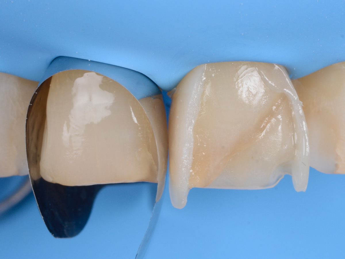 Die direkte Schichtung von Komposit- Verblendungen besteht in der direkten Applikation einer oder mehrerer Schichten Komposit-Kunststoff auf die Zahnstruktur. Das Komposit wird dann zur Farbkorrektur und zum Defektausgleich ausgeformt, sodass eine ästhetische Restauration generell in einer einzigen Behandlungssitzung erreicht werden kann (8). Zur Wiederherstellung der korrekten Form und des Emergenzprofils der Frontzähne können verschiedene Instrumente und Hilfsmittel verwendet werden. Bis heute wurden direkt geschichtete Komposit- Verblendungen am häufigsten bei der Restauration der approximalen und zervikalen Ränder eingesetzt. Dabei erfolgte die Restauration in zwei Schritten mit zwei Seitenzahnmatrizen (approximale Ränder) und einem Matrizenband, das für die Restauration des zervikalen Bereichs in eine spezifische Form zurechtgeschnitten wurde.