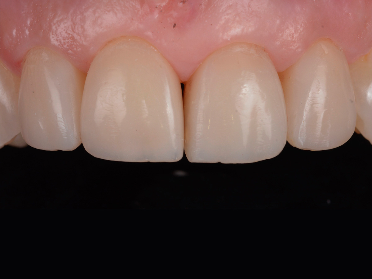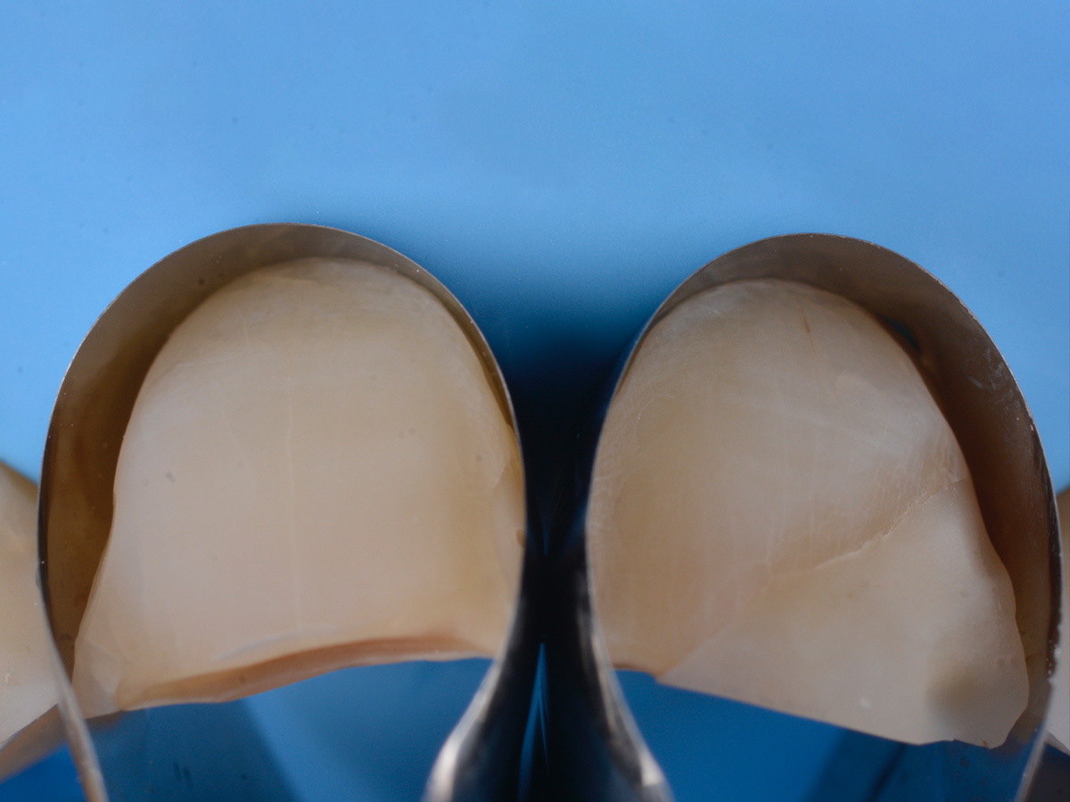 Das Bild zeigt die Komposit-Verblendungen auf den beiden seitlichen Schneidezähnen 12 und 22 vor dem Konturieren, Finieren und Polieren. Die Konturierung und das Finieren wurden mit einem Diamantfräser bei niedriger Drehzahl durchgeführt. Die niedrige Drehzahl ermöglicht eine besser zu kontrollierende Bewegung und verbessert die Oberflächenglätte, selbst bei grober Korngröße. Die Vorpolitur wurde anschließend mit einem braunen Spiralrad (3M, Deutschland) und Polierpaste (Premier, Diamond Twist SCL) durchgeführt. Für die Hochglanz-Politur beim Finieren kann ein Schwabbelrad verwendet werden.