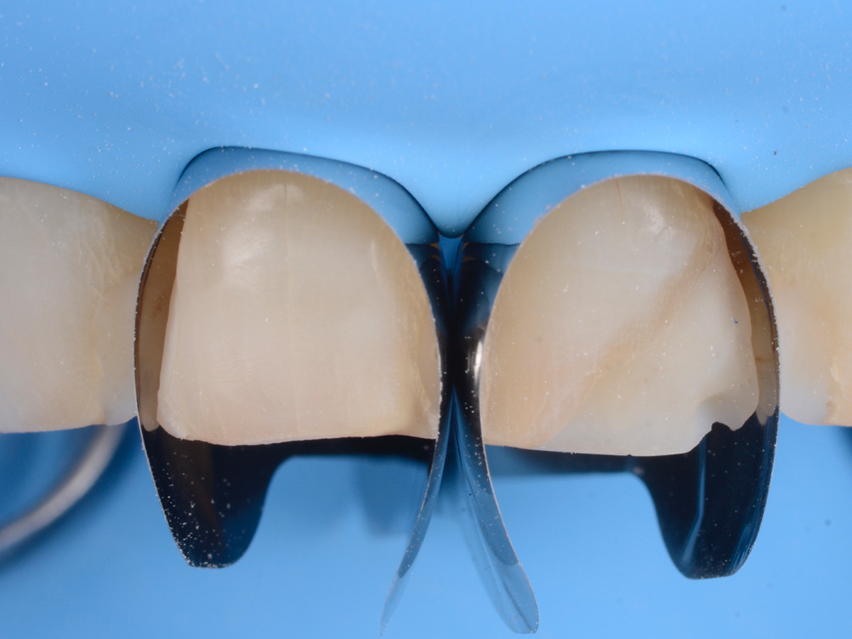 Das isolierte Gebiet nach Reinigung, Desinfektion und Polieren der Zahnoberflächen. Zur Wiederherstellung des Emergenzprofils der Frontzähne können verschiedene Methoden angewandt werden. Wir entschieden uns für die Verwendung der Frontzahnmatrize Unica anterior von Polydentia, da durch sie das Verfahren vereinfacht und die direkte Restauration des gesamten Emergenzprofils (zervikale und approximale Ränder) in nur einem Schritt möglich ist.