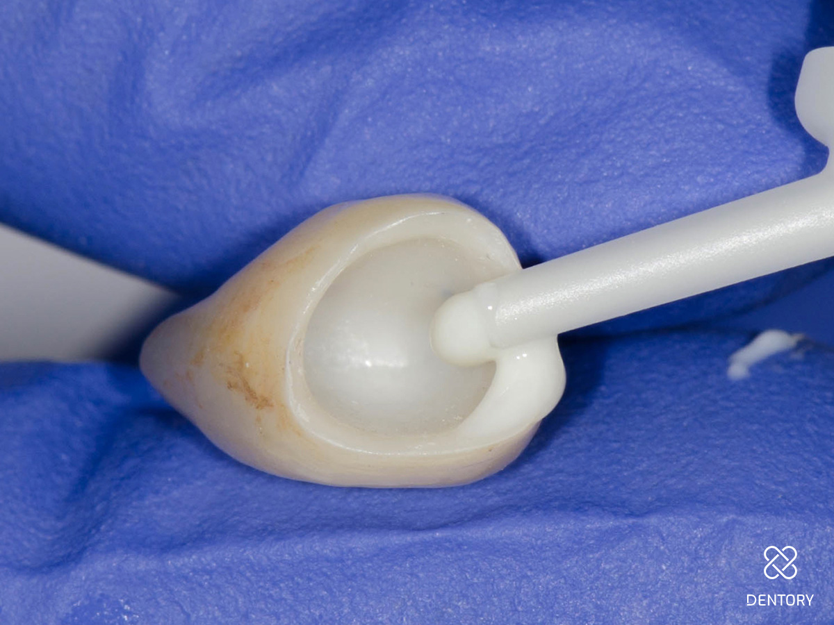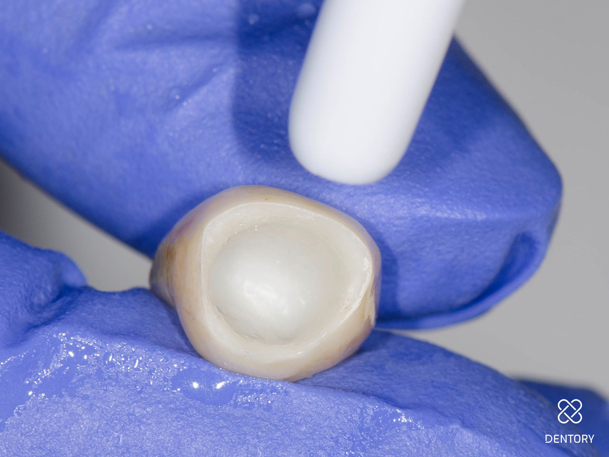 Nicht-abrasive Reinigung der Zirkonoxid-Fläche: Vor der definitiven Eingliederung wird die vom Labor vorbehandelte Oberfläche aus Keramik mit einem Reinigungsmittel dekontaminiert. Nach einer Einwirkzeit von 20 Sekunden wird das Reinigungsmittel sorgfältig mit Wasser abgesprüht und mit Luft getrocknet.