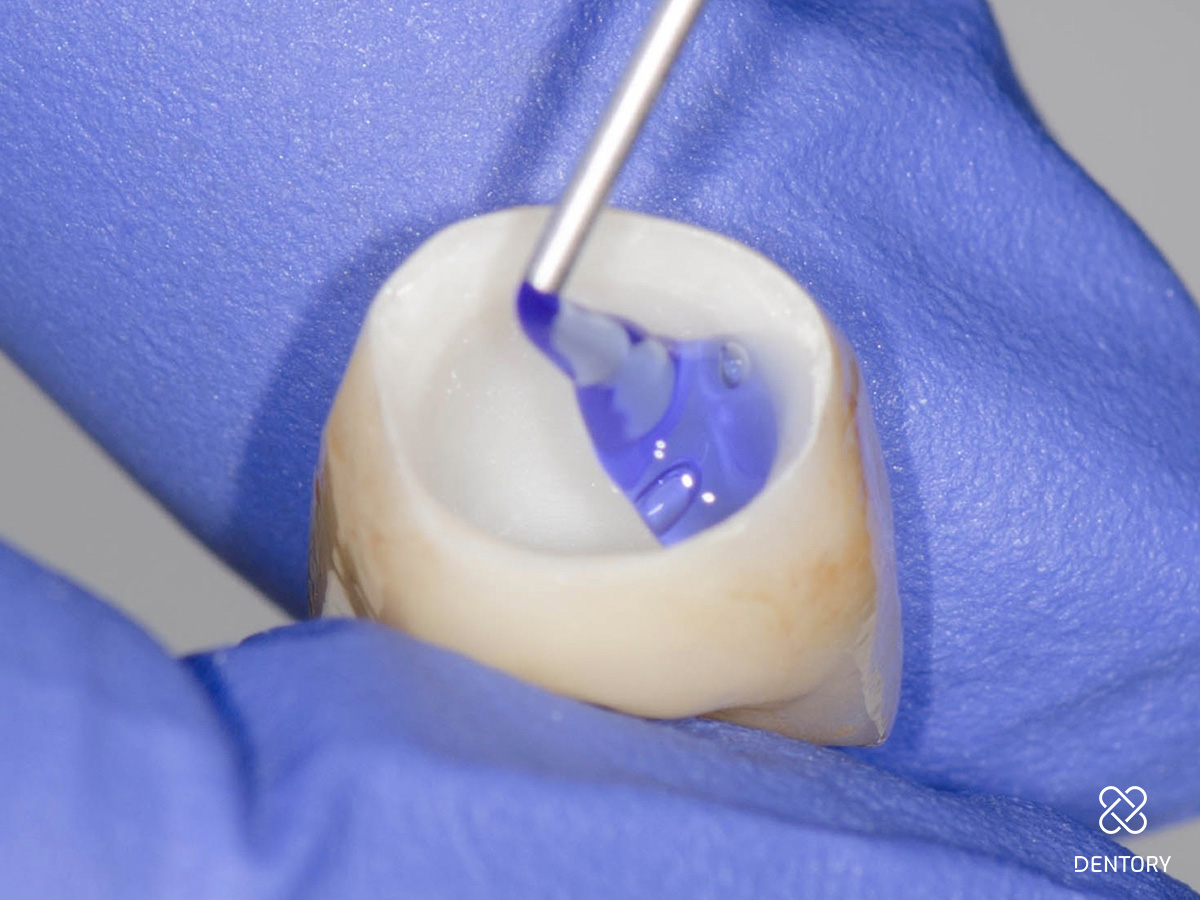 Applikation des Zements: Zur Eingliederung wird ein selbstadhäsiver Zement verwendet. Der Zement wird auf die innere Oberfläche der Krone appliziert und die Krone zügig auf den Stumpf platziert.