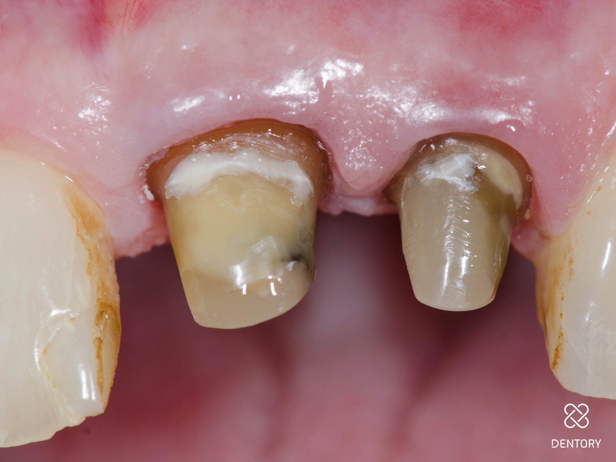 wurden ein ästhetisches Defizit wegen insuffizienter Kronenränder sowie Sekundärkaries an den Zähnen 21 und 22 diagnostiziert.
