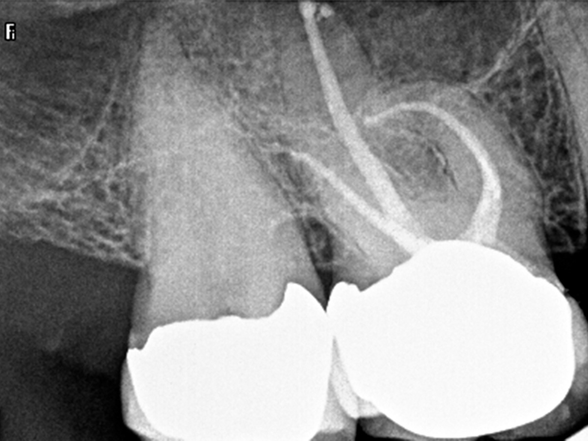 Der maschinelle Gleitpfad wurde mit der RACE EVO 15.04 geschaffen und die Kanäle bukkal bis 35.04 und palatinal bis 50.04 präpariert.
