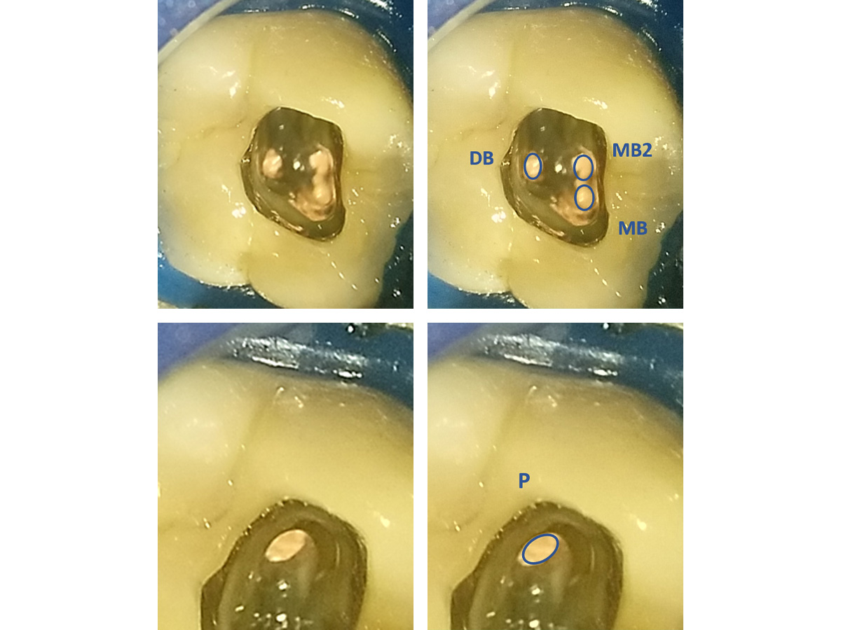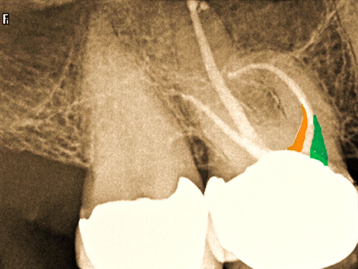 Mesiobukkal wurden zwei Kanäle aufbereitet, die apikal in einem Apex konfluieren.