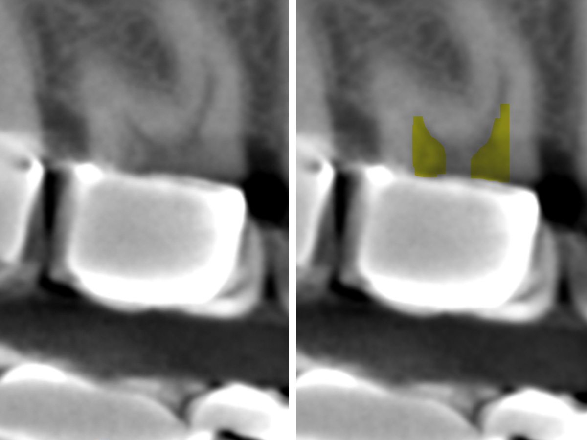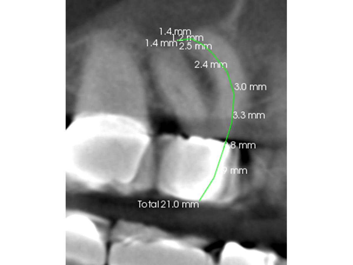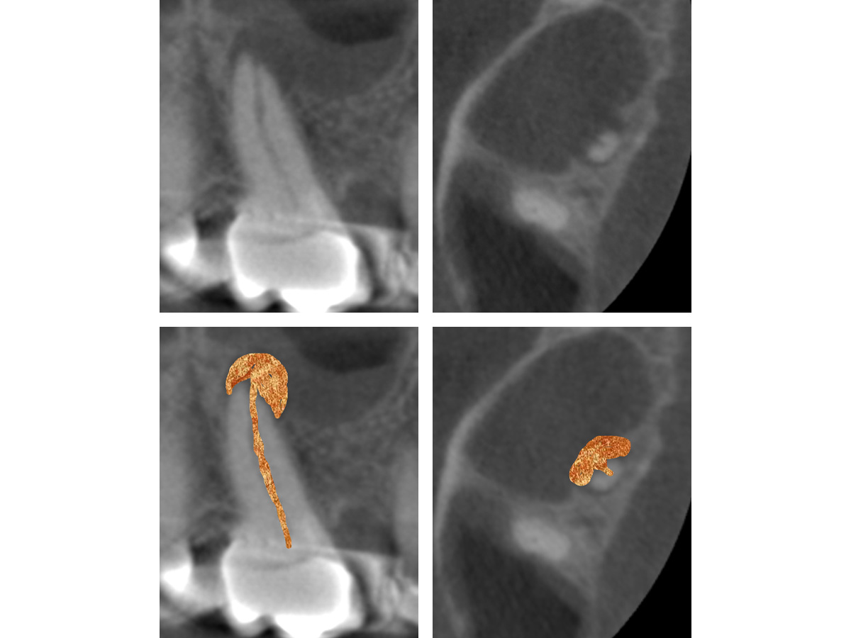 Nach der DVT-Untersuchung (Kodak 9000 3D, Auflösung 0,076 mm) bestätigte sich eine apikale Parodontitis an Zahn 16 palatinal. Eine Wurzelkanalbehandlung an Zahn 16 ist indiziert.