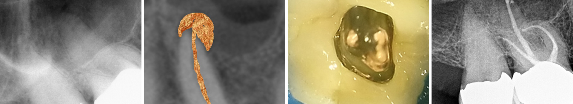Die klassische Aufbereitung bei gekrümmten Kanälen erfolgt durch Erweiterung des Kanaleingangs mit konventionellen Stahlbohrern (Gates Glidden) oder NiTi Introfeilen mit höherer Konizität, was zu einer unnötigen Entfernung von Dentin am Kanaleingang führt (oranger Bereich). Um diese zu vermeiden wurden die Kanäle mit wärmebehandelten Niti-Feilen der neuesten Generation (FKG RACE EVO) bei 1.000 rmp/ 1,5 N-cm aufbereitet.