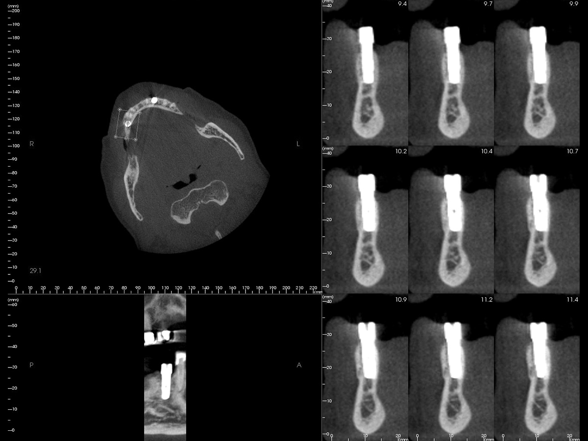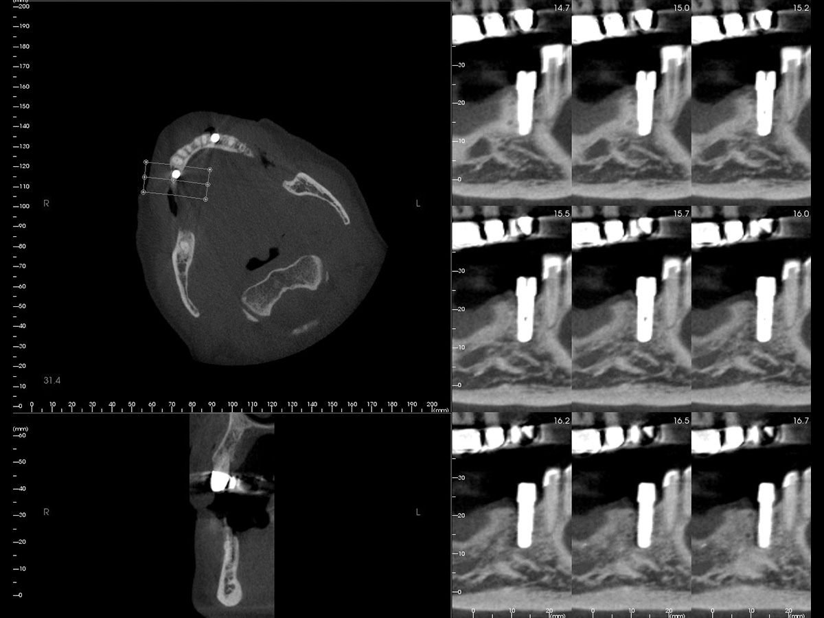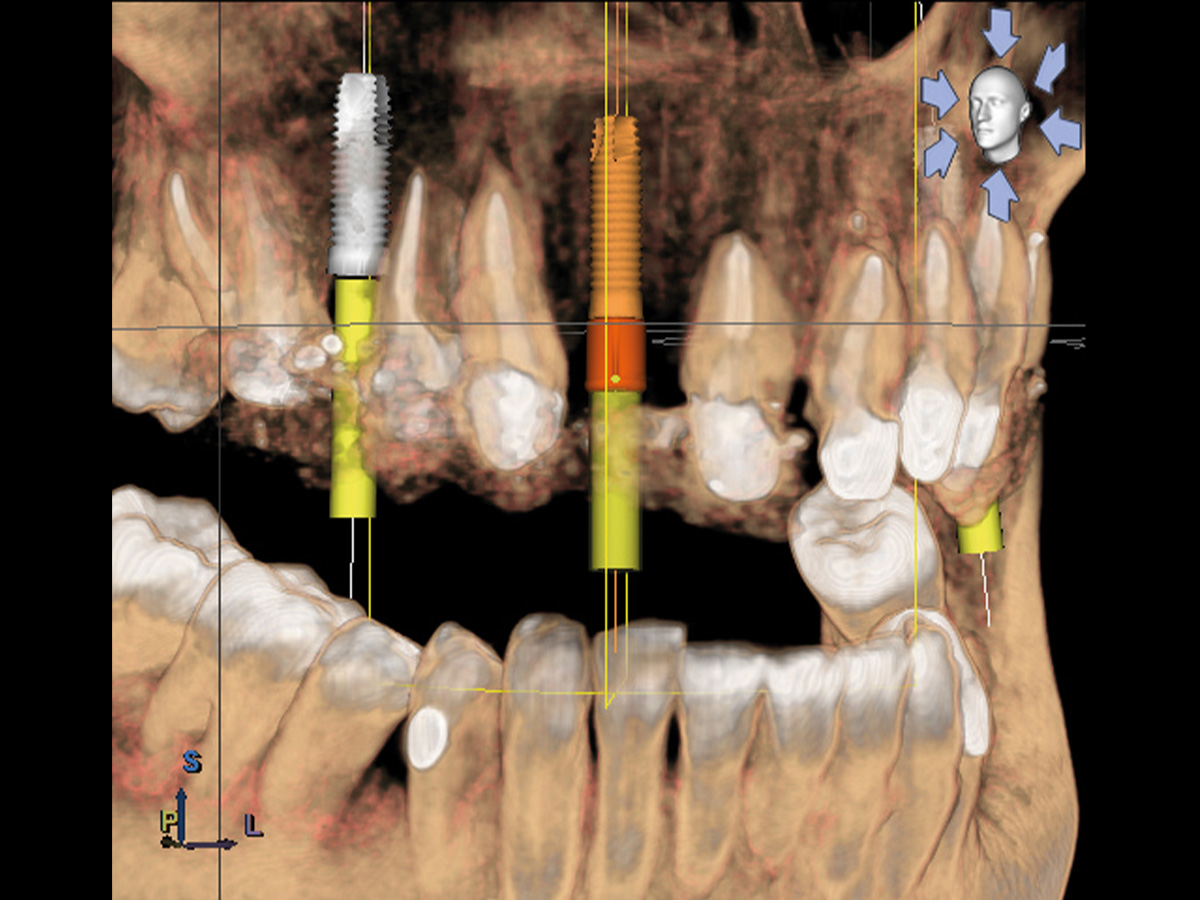 DVT mit Implantatplanung zeigt die atrophe Knochensituation mit geplantem Implantat.