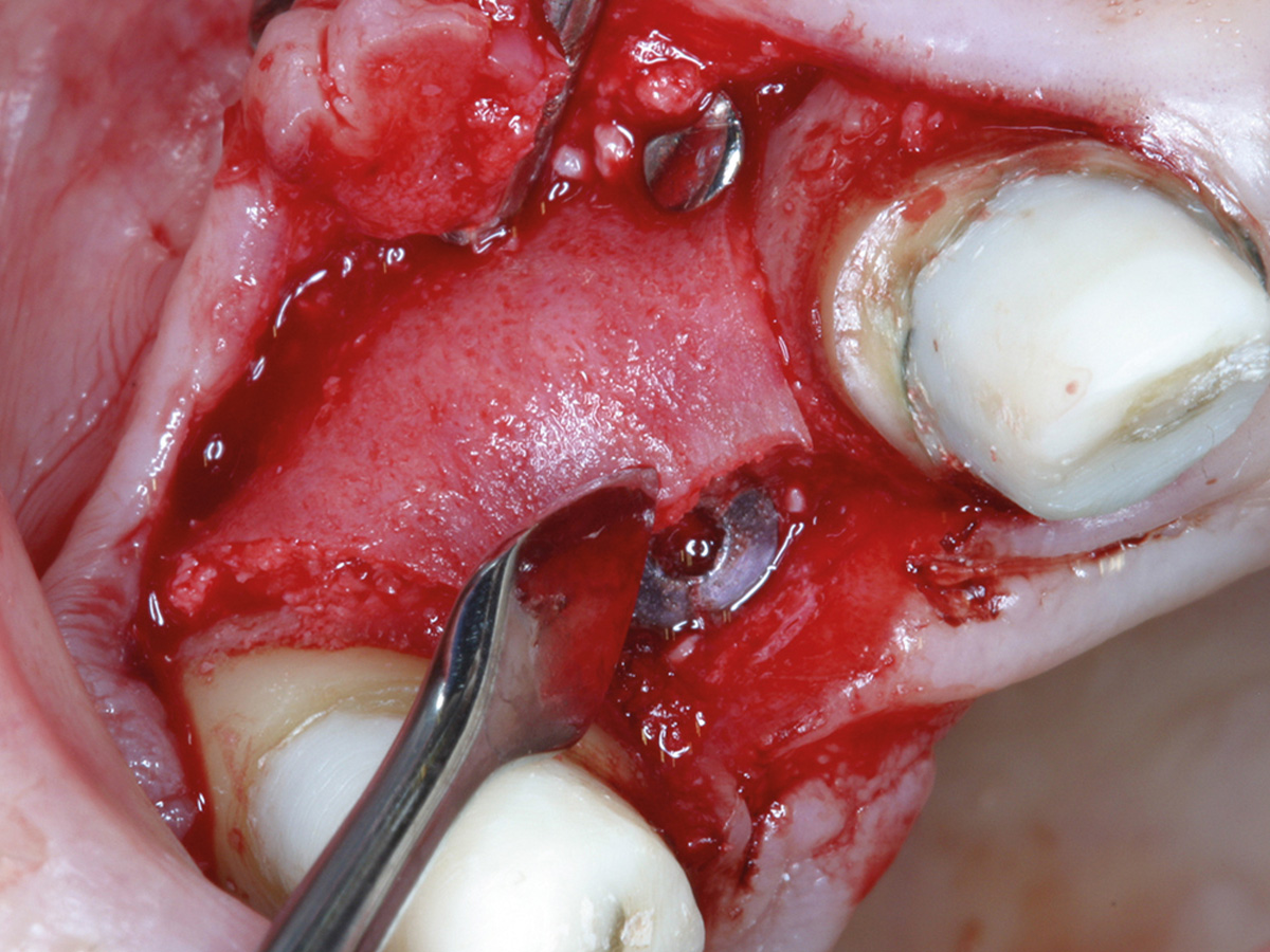 Intraoperative Situation mit koronaler Knochenbrücke und extraalveolär imponierendem Implantat (Biomet 3,2 x 13).