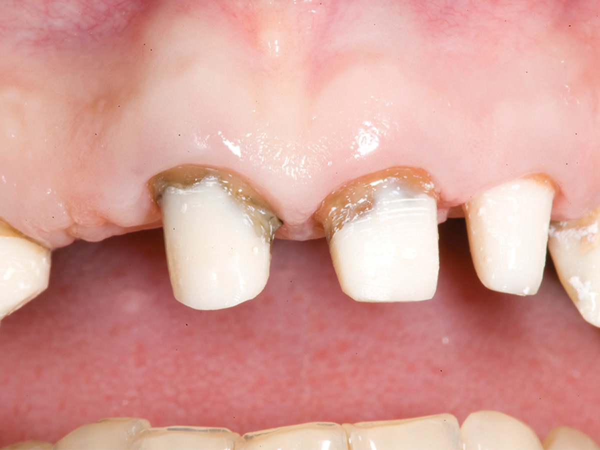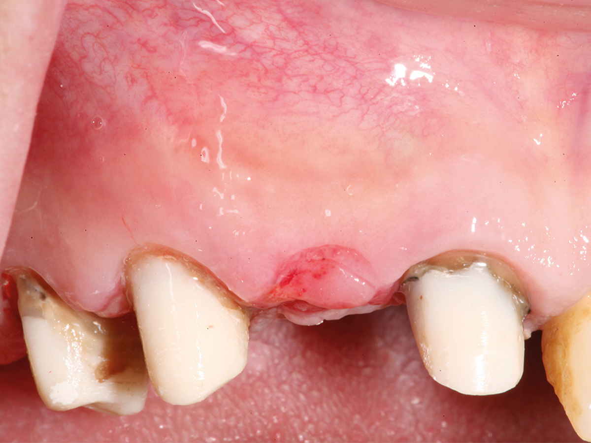Präoperative Ausgangslage der atrophen Knochensituation mit geplantem Implantat.