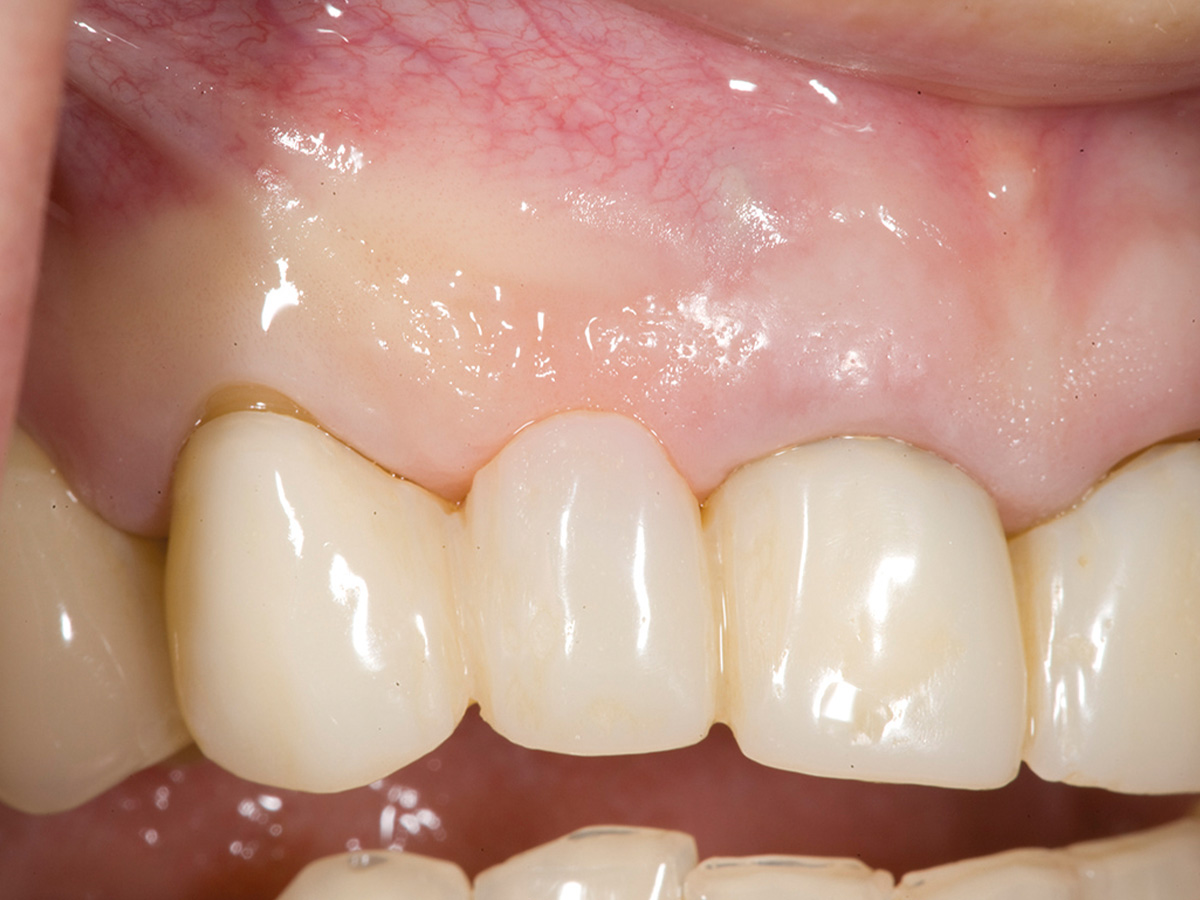6 Monate post-OP nach Freilegung. Zu beachten ist der Alveolarkamm im Gegensatz zum Ausgangsbefund.