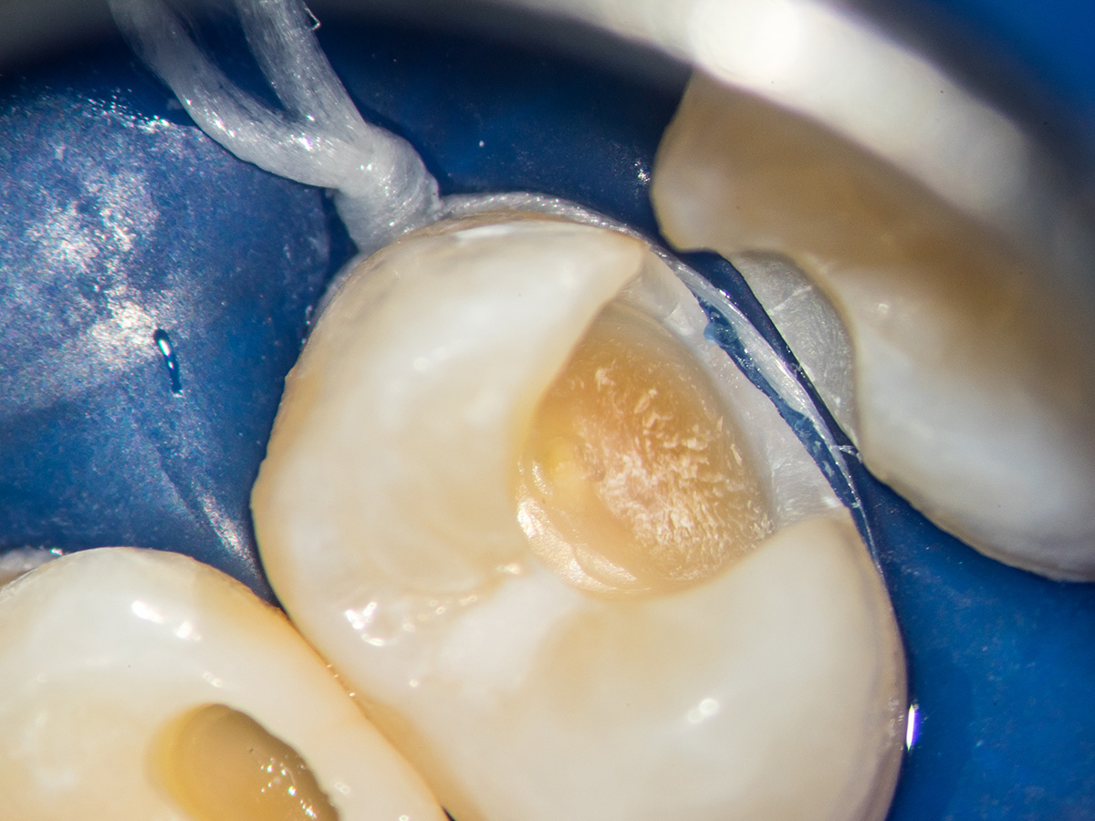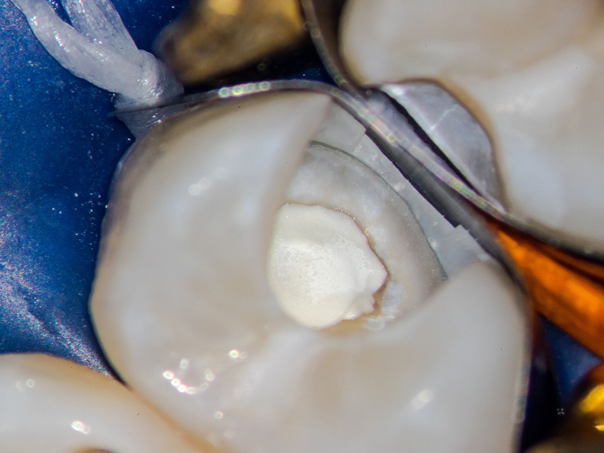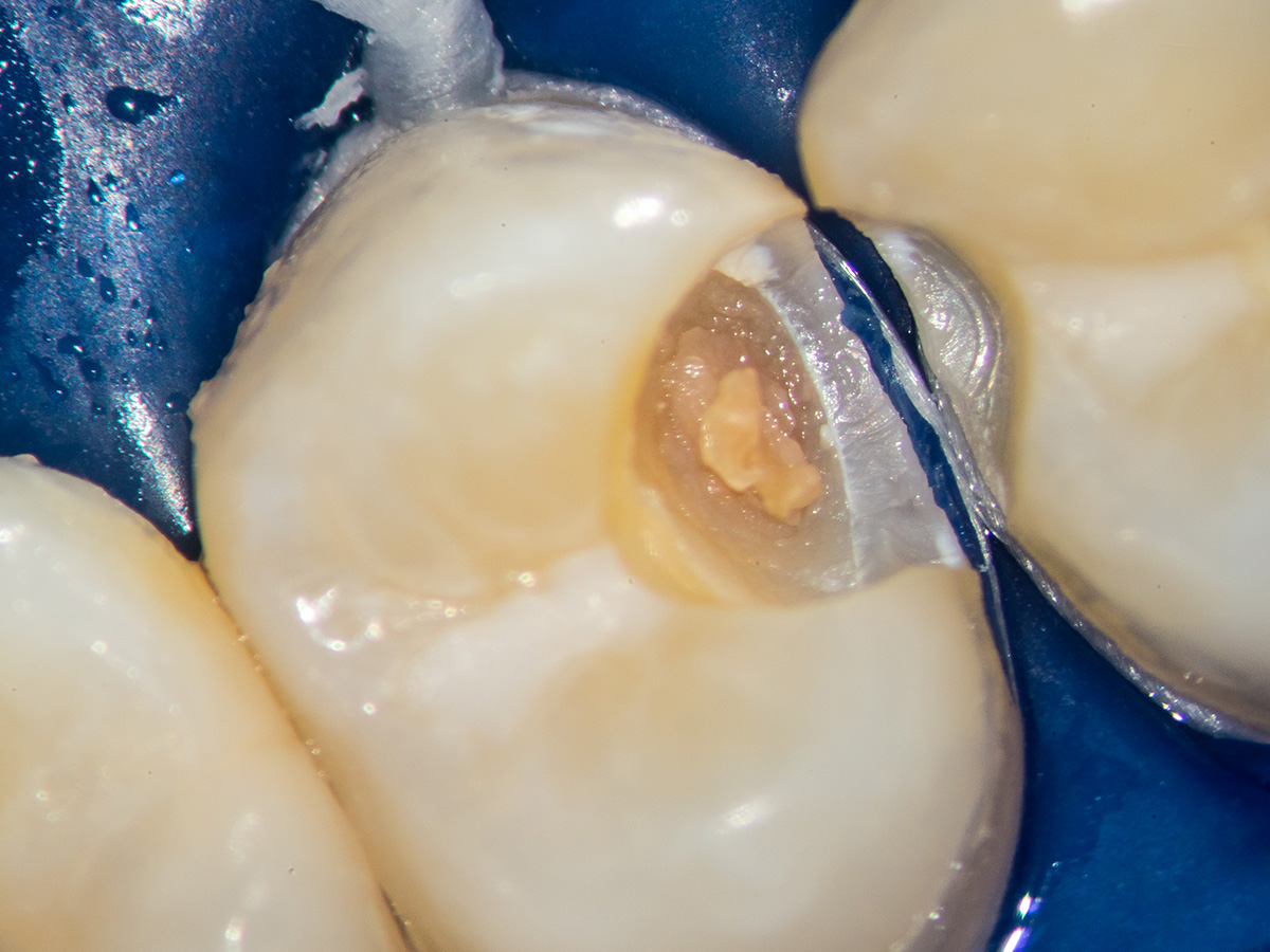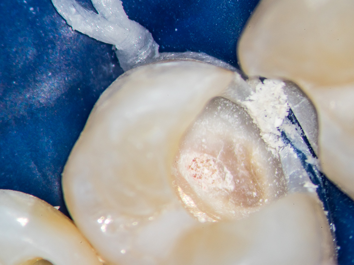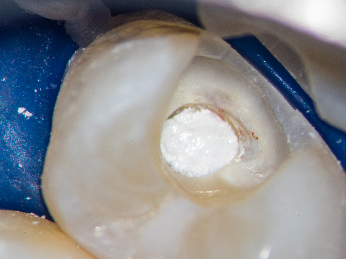 Detail der vorbereiteten Kavität. Man sieht die Theracalabdeckung über dem BioCeramic-Putty.