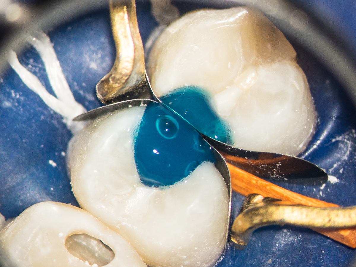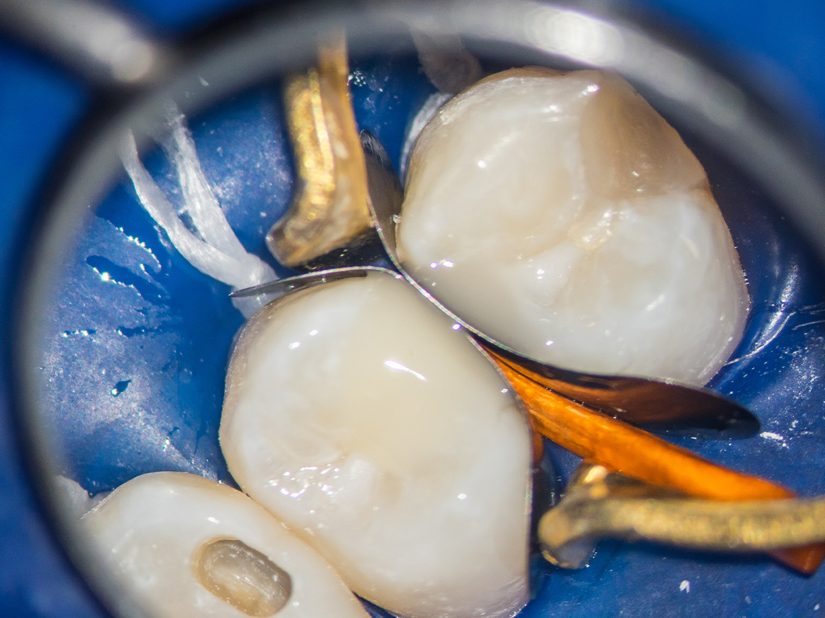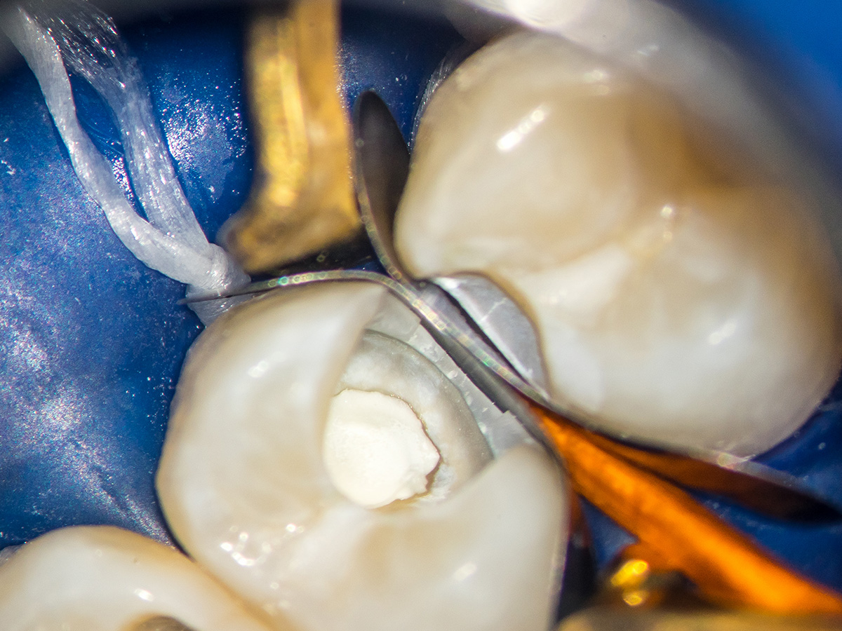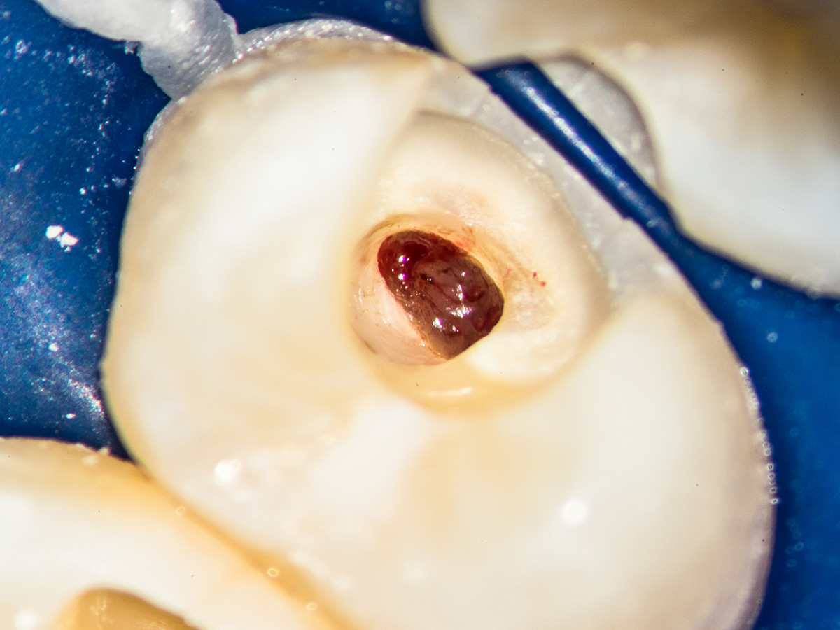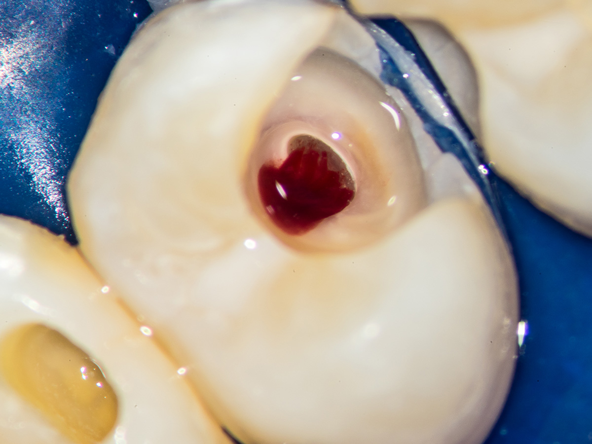 Detail der vorbereiteten Kavität. Man sieht die Theracalabdeckung über dem BioCeramic-Putty.