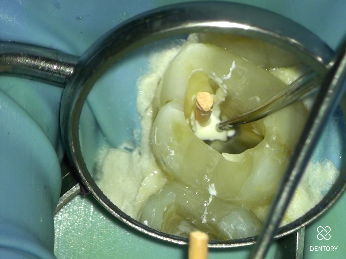Aufbaufüllung: Versorgung des Zahnes mit einer dichten und stabilen Aufbaufüllung vor Beginn der Wurzelbehandlung. Am besten sind dafür adhäsiv befestigte Kompositfüllungen geeignet.