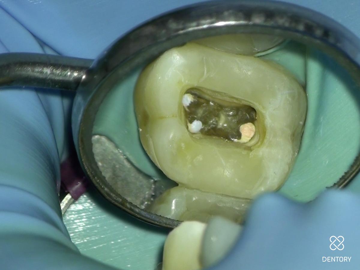 Der weißliche mb2-Kanaleingang hebt sich vom dunkleren Pulpenboden ab.