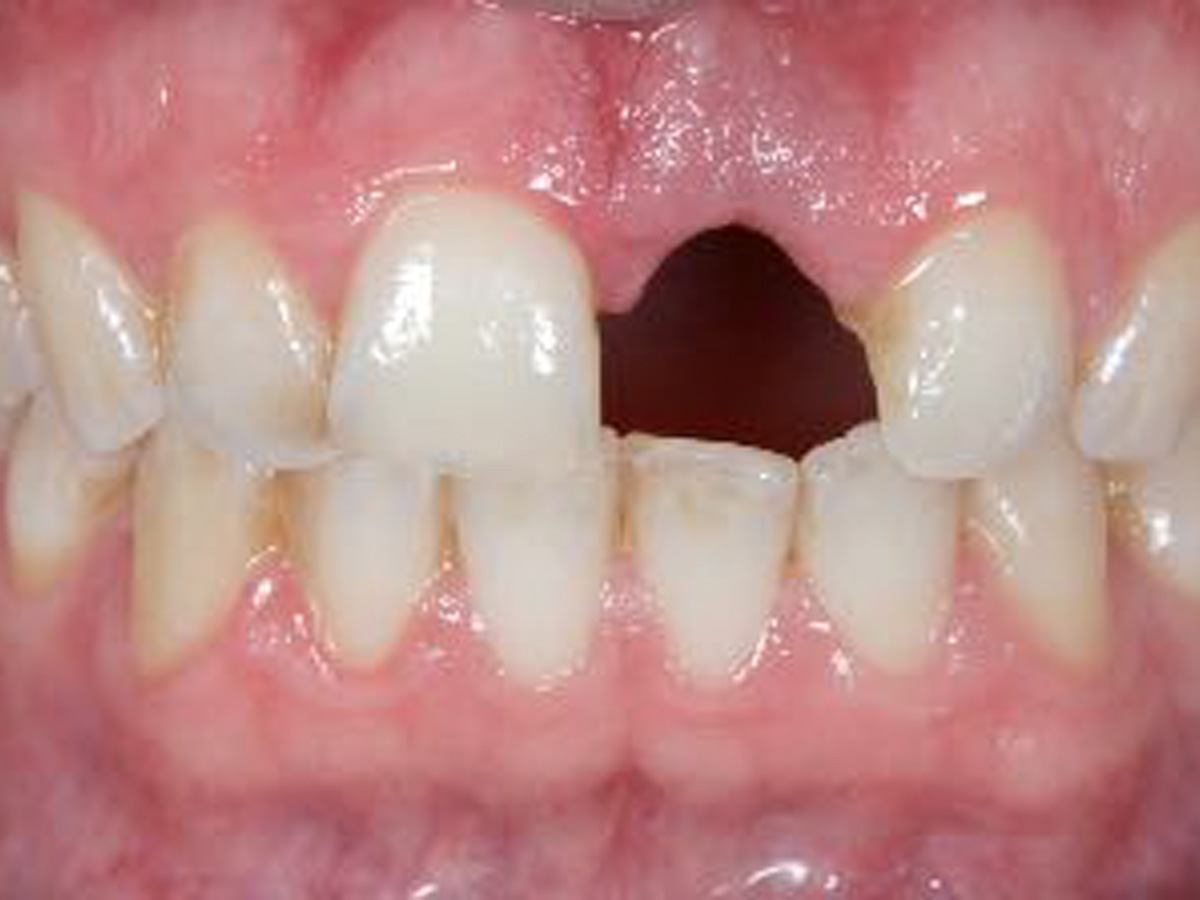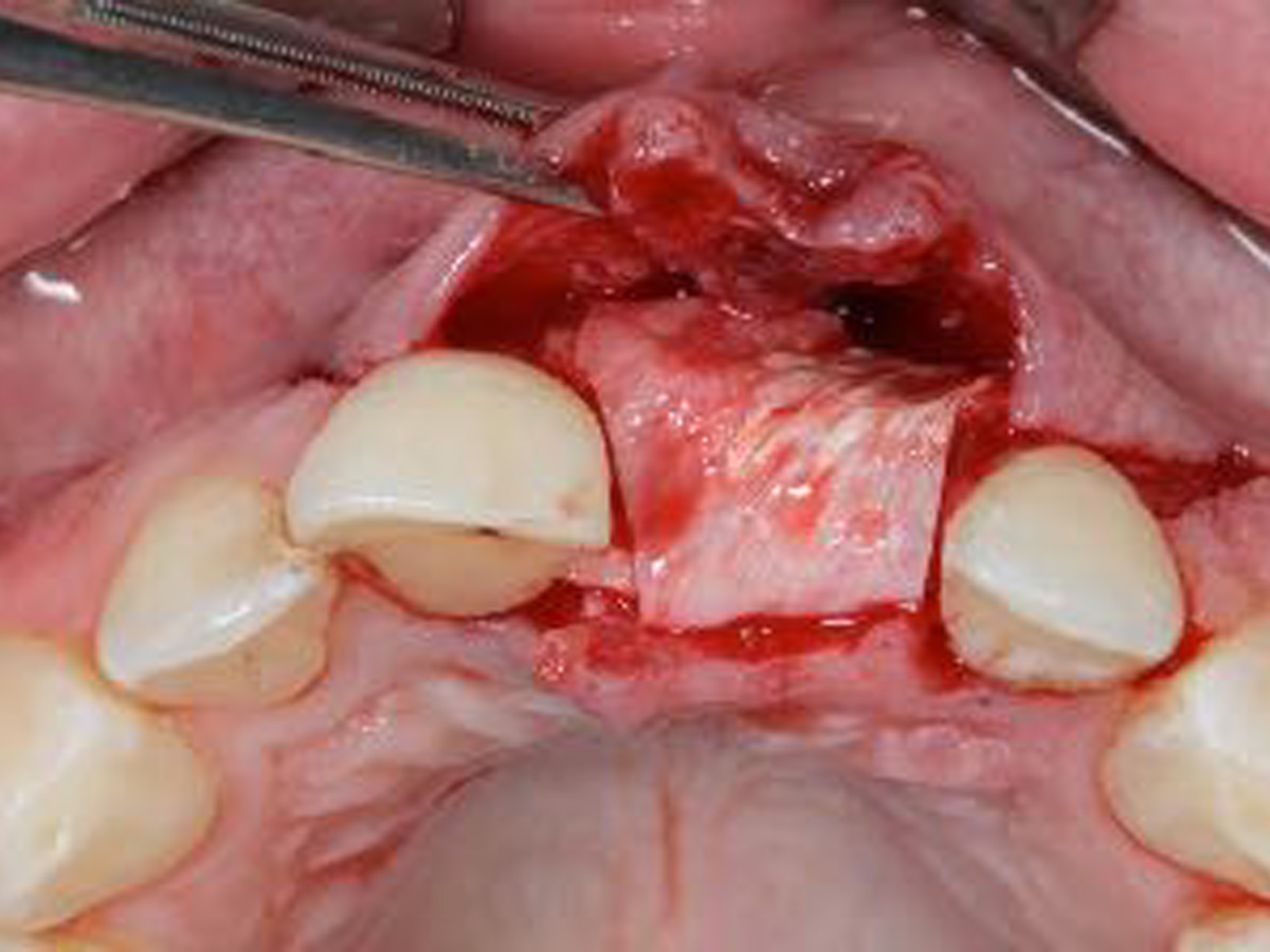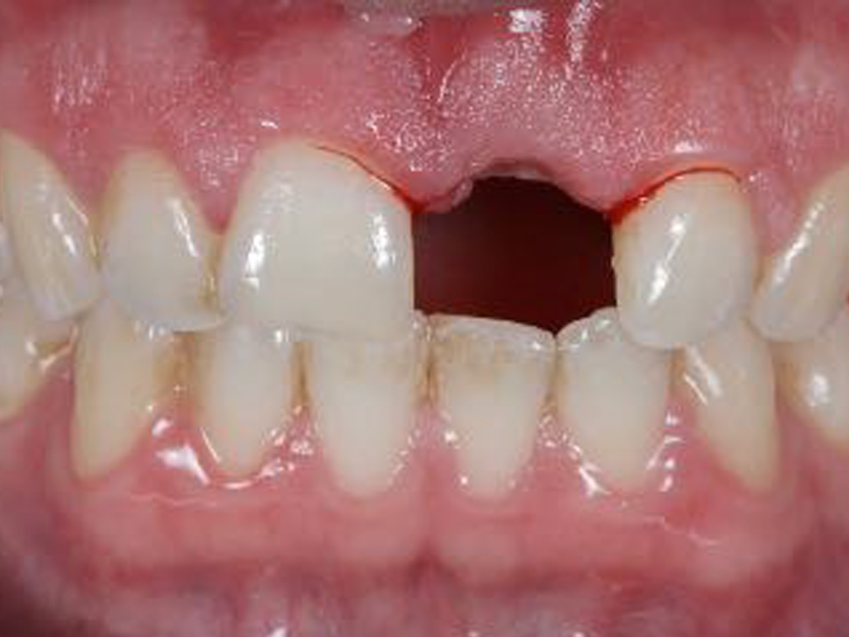 Ausgangssituation nach chirurgischer Entfernung eines Schneidezahns mit externer Wurzelresorption.