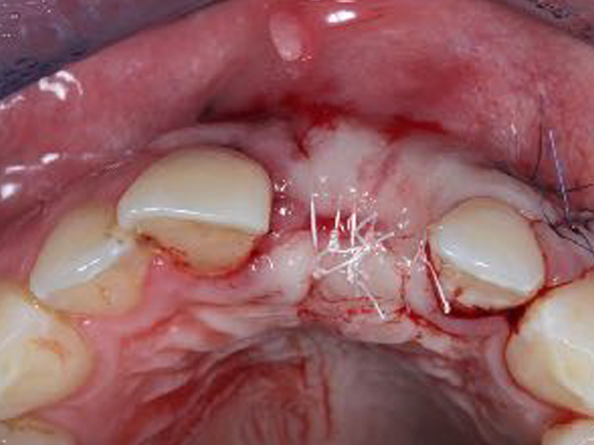 Die Stelle wird mit einer Membran aus nativem Kollagen (Evolution, OsteoBiol®) abgedeckt.