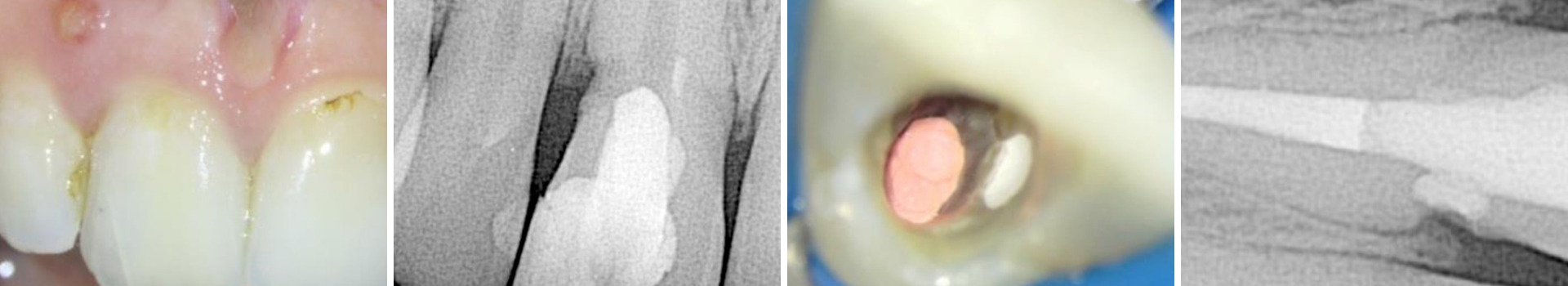 Klinische und röntgenografische Ansichten zeigen eine Fistelbildung, die bei genauerer Untersuchung zu einem distal liegenden, zervikalen Defekt an Zahn 11 führte.