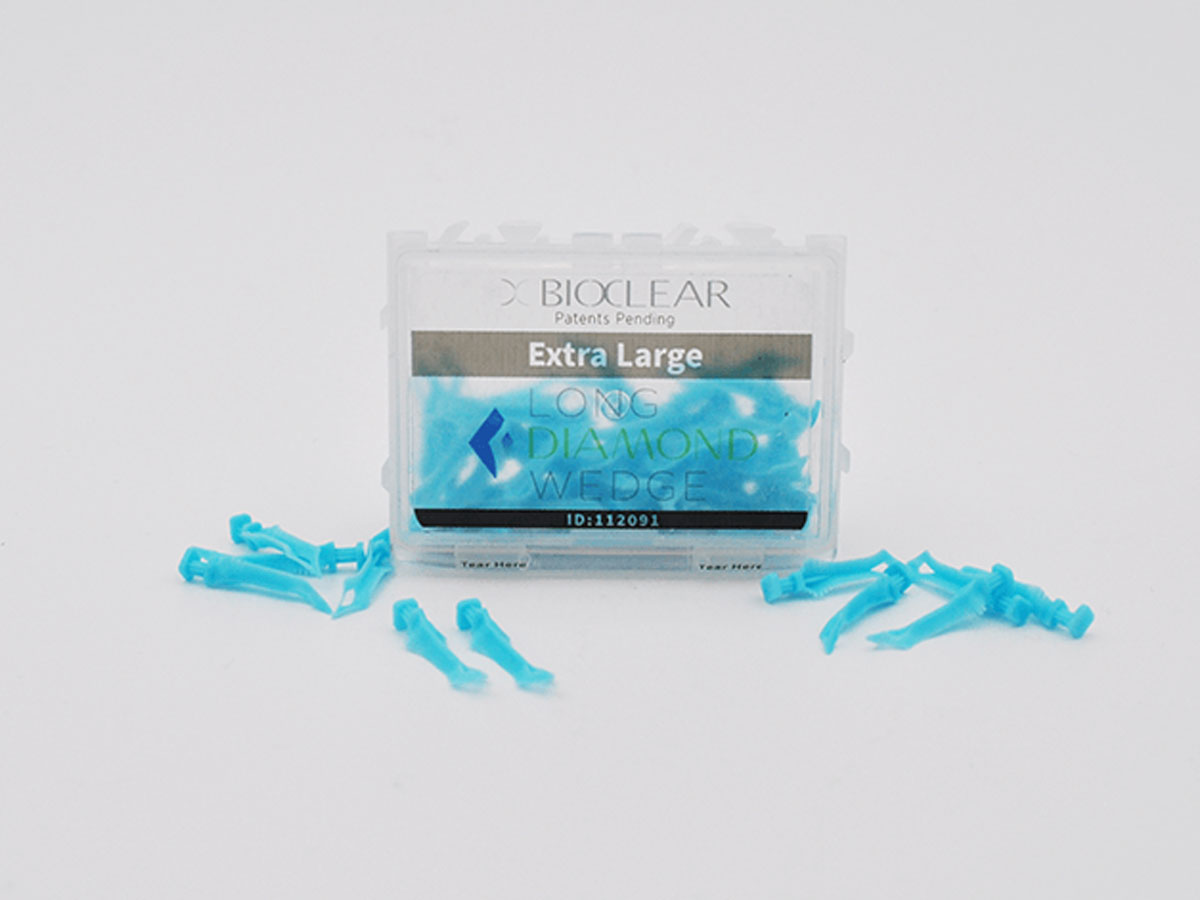 Der Diamond Wedge, der von der Natur inspiriert ist, aus sehr flexiblem Material besteht und einen diamantförmigen Ausschnitt an der Spitze hat, erzeugt nur minimalen Druck, da er während des Einsetzens zusammenklappt. Er springt auf, sobald er die Interdentaleinziehung durchdrungen hat, was eine starke Abdichtung garantiert und dafür sorgt, dass der Keil festsitzt. Es kommt dadurch zu keinem unkontrollierten Fluss von überschüssigem Komposit. Die Zahnseparation ist stark, gleichzeitig sorgt die Flexibilität des Diamond Wedge für einen hervorragenden Randschluss und ein minimalinvasives Vorgehen, da beim Durchdringen der Interdentaleinziehung wenig Druck ausgeübt werden muss.