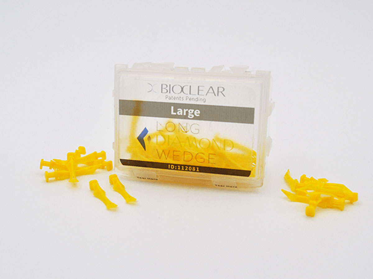 Der Diamond Wedge, der von der Natur inspiriert ist, aus sehr flexiblem Material besteht und einen diamantförmigen Ausschnitt an der Spitze hat, erzeugt nur minimalen Druck, da er während des Einsetzens zusammenklappt. Er springt auf, sobald er die Interdentaleinziehung durchdrungen hat, was eine starke Abdichtung garantiert und dafür sorgt, dass der Keil festsitzt. Es kommt dadurch zu keinem unkontrollierten Fluss von überschüssigem Komposit. Die Zahnseparation ist stark, gleichzeitig sorgt die Flexibilität des Diamond Wedge für einen hervorragenden Randschluss und ein minimalinvasives Vorgehen, da beim Durchdringen der Interdentaleinziehung wenig Druck ausgeübt werden muss.