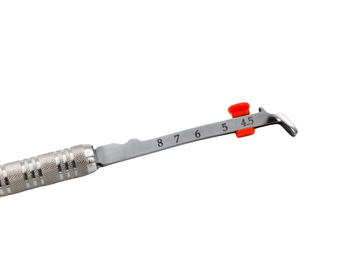 · Die zweite Seite hat einen verstellbaren Knopf: zur Ausdehnung oder Stauchung, um eine größere Bandbreite an Zahngrößen zu erreichen.