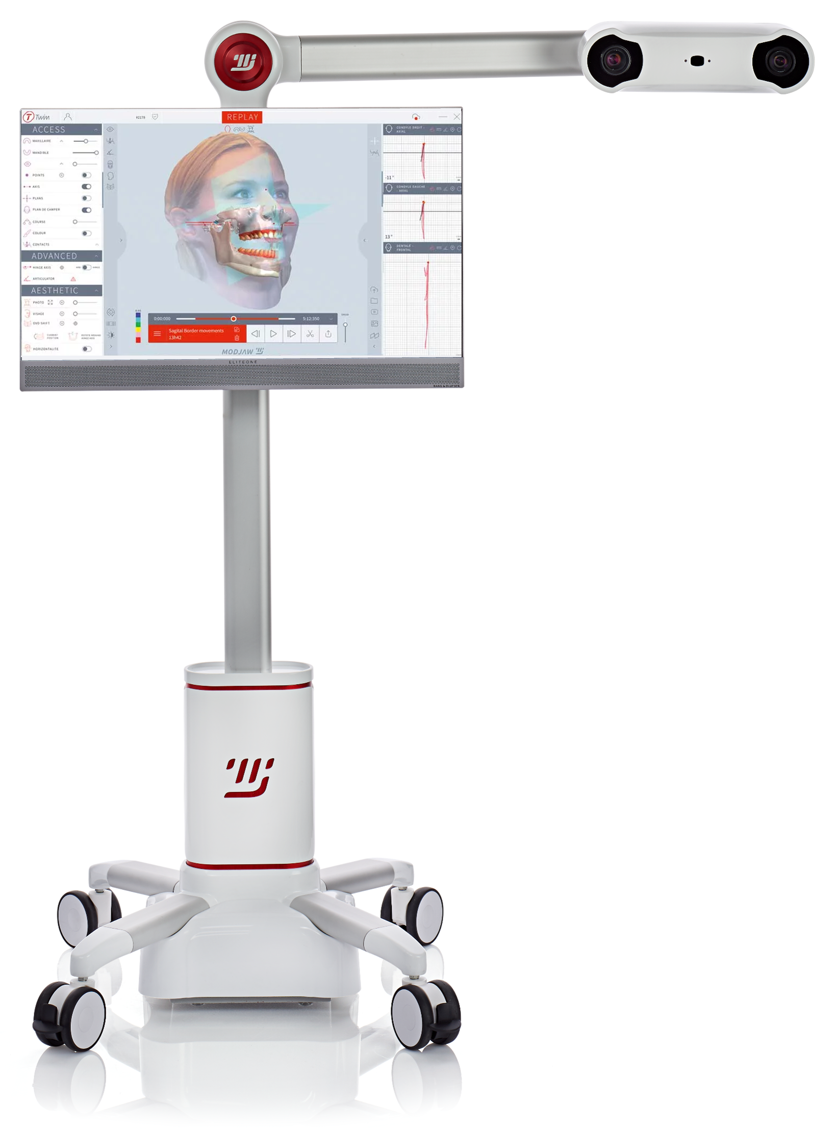 Der Funktionsscanner zeichnet die Bewegungen des Unterkiefers in Relation zum Oberkiefer präzise auf. Die Echtzeitdarstellung steigert die Compliance des Patienten und ermöglicht eine umfassende Diagnostik. Kombiniert mit einem Facescan und einem segmentierten DVT, bietet Modjaw® die Möglichkeit einer ganzheitlichen Analyse. Die aufgezeichneten Bewegungsdaten können nahtlos in alle gängigen Formate exportiert werden, beispielsweise in die CAD-Software des Technikers für digitale Artikulatoren oder SmileFy.