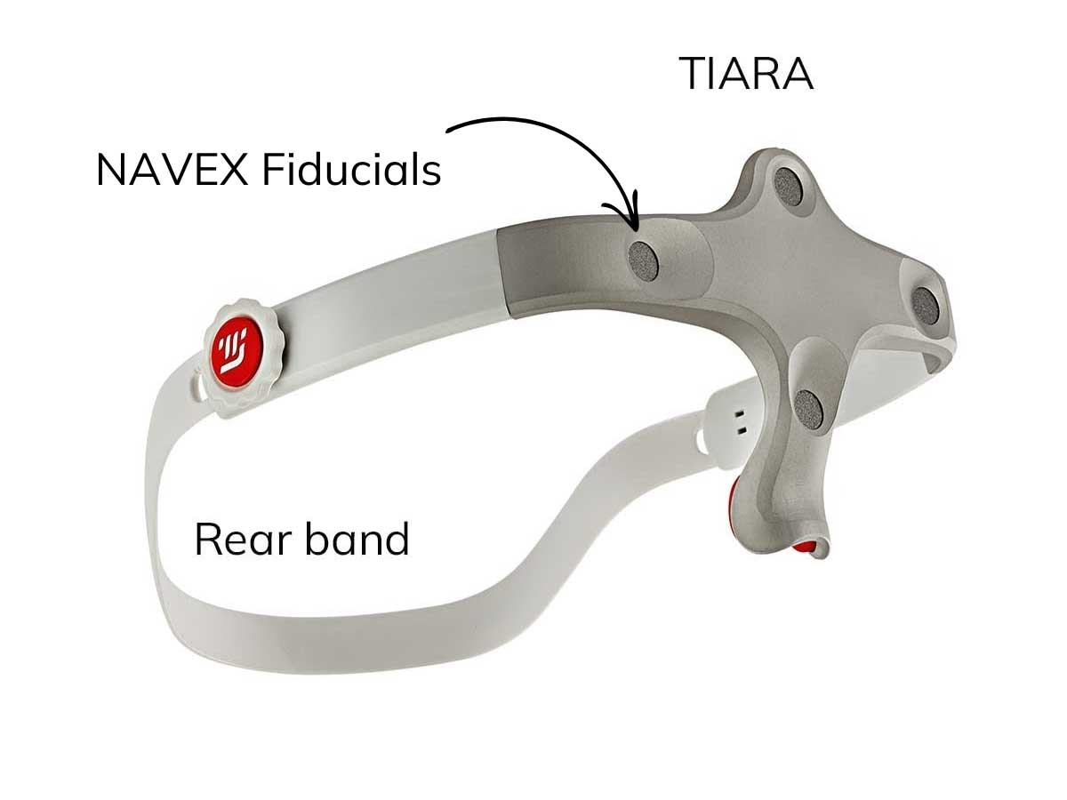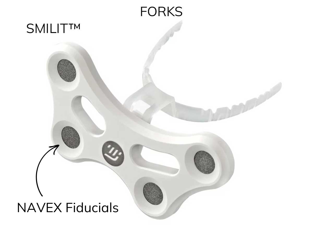 · die reflektierenden Marker sitzen im SMILIT™-Unterkiefer-Tracker und in dem TIARA-Frontal-Tracker